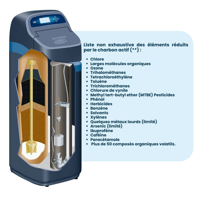 Ce double processus retire les impuretés et les mauvaises odeurs pour vous offrir une eau douce, pure et agréable à utiliser, que ce soit pour boire, cuisiner ou prendre soin de votre peau.